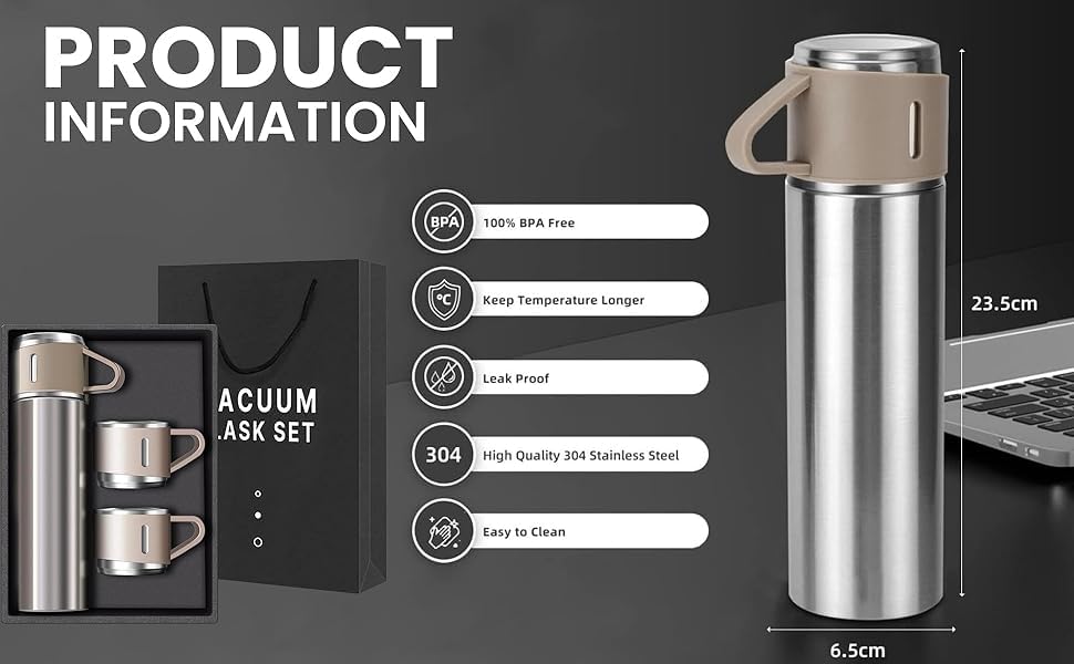 • Vacuum Flask Gift Set: Includes 1 insulated stainless steel bottle and 2 drinking cups, ideal for sharing hot beverages